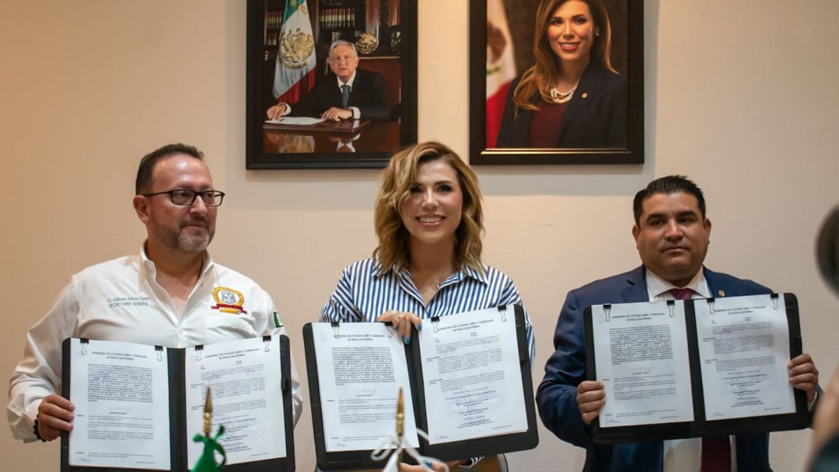 Tijuana, Baja California.- Este día, en las instalaciones del Centro Estatal de las Artes (CEART), la gobernadora de Baja California, Marina del Pilar, se reunió con el Secretario Estatal del Sindicato de Burócratas de Baja California, Guillermo Aldrete, y con el Oficial Mayor del Estado, David R. Cervantes Aguilar, para llevar a cabo la firma de un convenio destinado a mejorar las condiciones generales de los trabajadores de la Comisión Estatal de Servicios Públicos de Tijuana (CESPT).