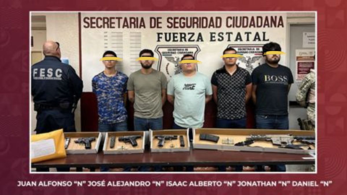 Los agentes ingresaron al domicilio al tratarse de un delito en flagrancia y lograron detener al individuo, encontrando además a otras cuatro personas armadas en el interior de la vivienda. Los detenidos fueron identificados como Juan Alfonso “N” (20 años), José Alejandro “N” (23 años), Isaac Alberto “N” (24 años), Jonathan “N” (19 años) y Daniel “N” (18 años), todos originarios de Mexicali, Baja California.