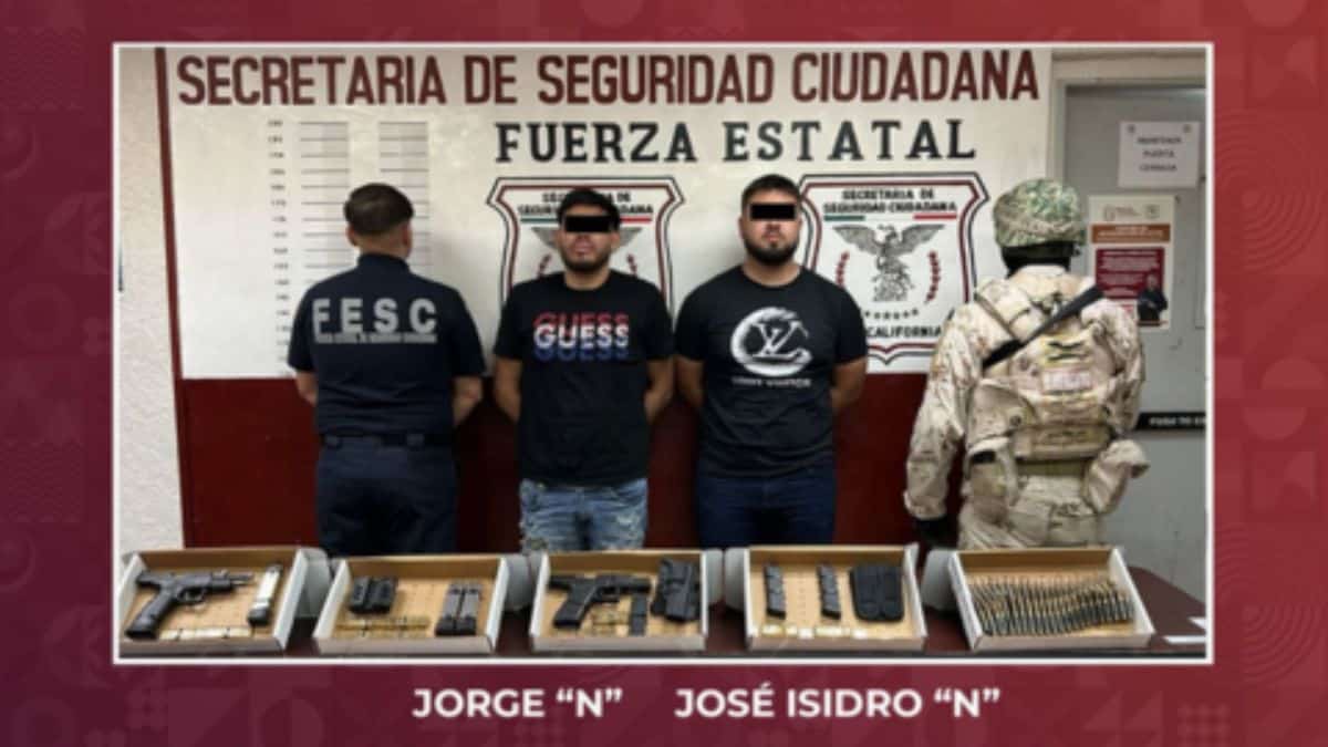 José Isidro “N” y Jorge “N” fueron trasladados a la base de la FESC en Mexicali y, junto con las armas y municiones incautadas, fueron puestos a disposición de la Fiscalía General de la República (FGR) por el delito de portación de armas de fuego y cartuchos de uso exclusivo del ejército.