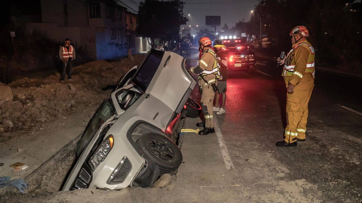 Tijuana, Baja California.- La noche del sábado 5 de octubre, alrededor de las 9:30 pm, una conductora protagonizó un accidente de tránsito en el Bulevar Fundadores, a la altura del Servicio Médico Forense, al caer en una excavación destinada al remplazo de una tubería.