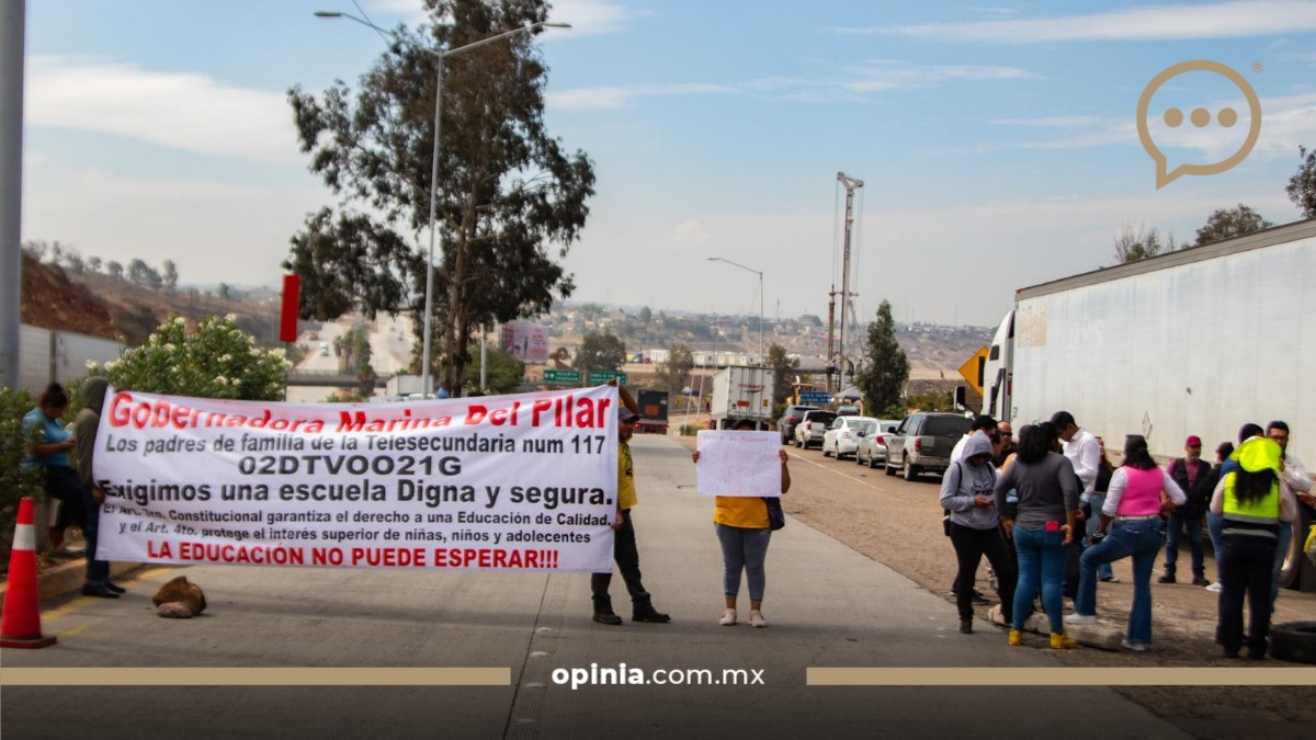 Tijuana, B. C.- Jueves 18 de septiembre de 2025.- Padres de familia de la Telesecundaria #117, ubicada en la colonia Lomas del Encinal, realizaron un bloqueo en la salida de la caseta de cuota Tijuana-Tecate, conocida como Cimarrón, para exigir la instalación de baños portátiles en el plantel, que opera desde hace más de 13 años sin drenaje ni energía eléctrica.