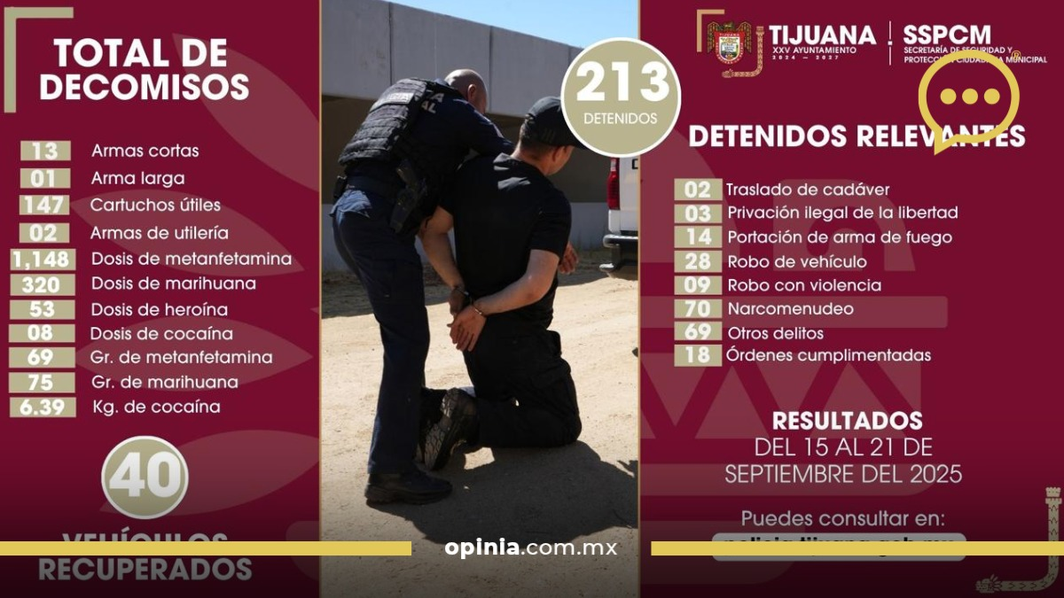 Tijuana, Baja California.- La Secretaría de Seguridad y Protección Ciudadana Municipal de Tijuana (SSPCM) informó que, entre el 15 y el 21 de septiembre, se logró el aseguramiento de 213 personas y 14 armas de fuego, como parte de la estrategia integral impulsada por el presidente municipal Ismael Burgueño Ruiz para recuperar la paz y tranquilidad en la ciudad.