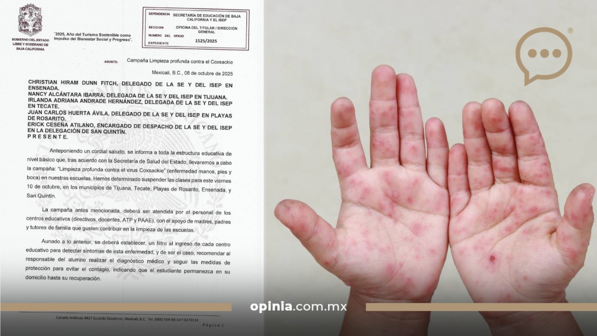 RedacciónLa Secretaría de Educación Estatal anunció la suspensión de clases presenciales este viernes 10 de octubre en los niveles de preescolar, primaria y secundaria de los municipios de Tijuana, Tecate, Playas de Rosarito, Ensenada y San Quintín, como medida preventiva ante el brote del virus coxsackie.