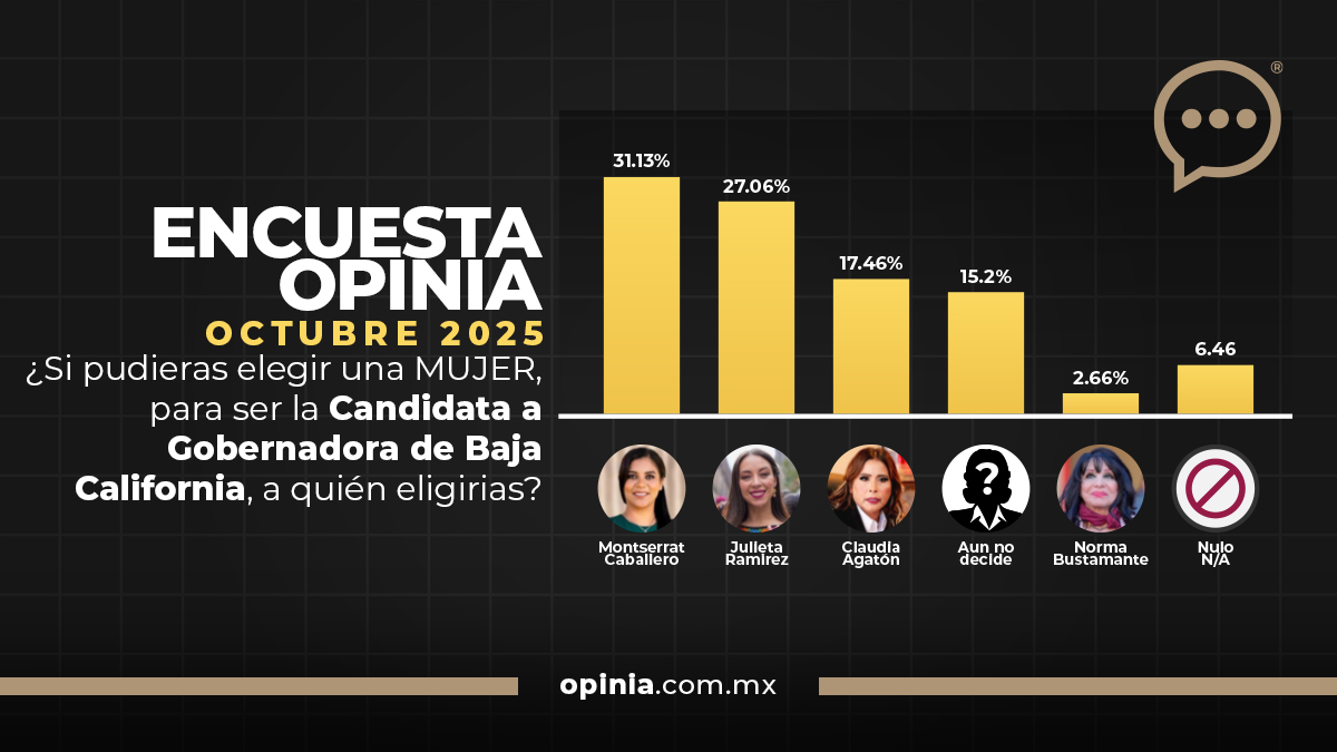 La más reciente Encuesta Opinia de octubre 2025 muestra que Montserrat Caballero, alcaldesa de Tijuana, se perfila como la figura femenina con mayor respaldo ciudadano para ser candidata a la gubernatura de Baja California, al obtener 31.13% de las preferencias.