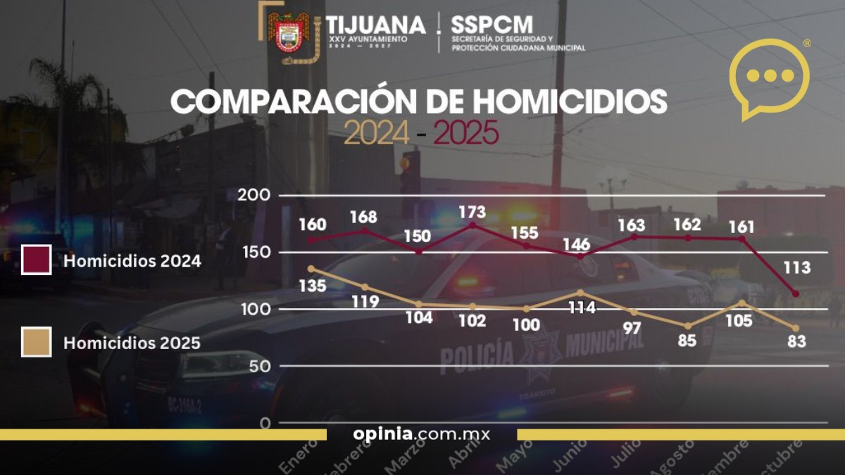 Tijuana | La Secretaría de Seguridad y Protección Ciudadana Municipal (SSPCM) informó que durante octubre se registraron 83 homicidios en Tijuana, una reducción de 30 casos en comparación con el mismo mes del año anterior.