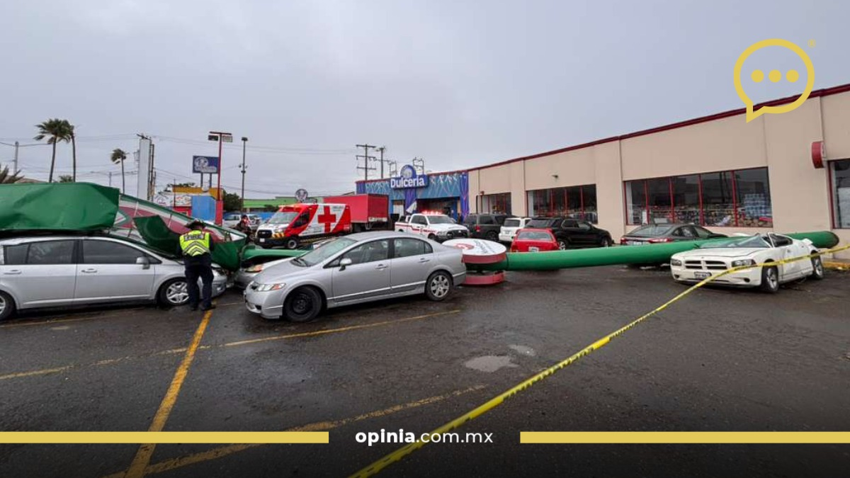 Tijuana .- Un letrero espectacular de la tienda “Waldo’s”, ubicada en la colonia Soler, colapsó este martes tras los fuertes vientos registrados en la ciudad, cayendo sobre varios vehículos que se encontraban estacionados dentro de una plaza comercial.