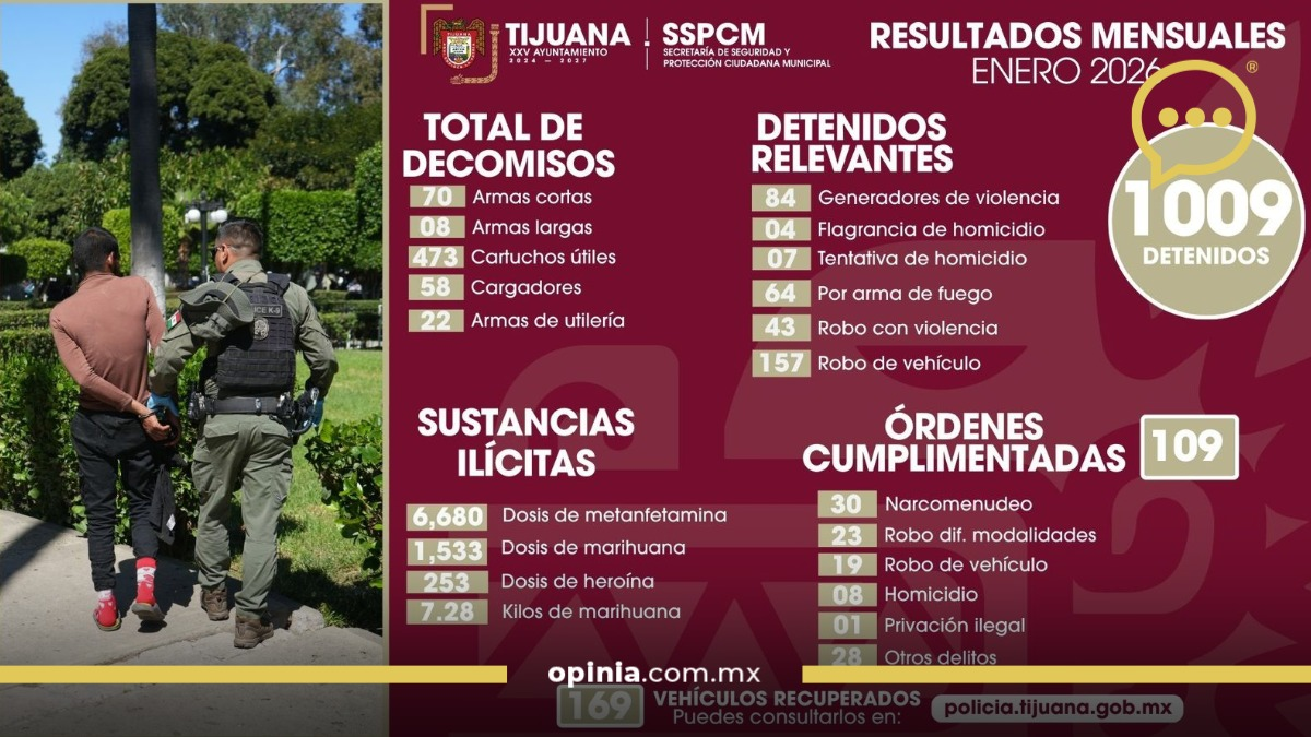 La corporación municipal también informó sobre la recuperación de 169 vehículos con reporte de robo, los cuales pueden ser verificados a través del portal oficial policia.tijuana.gob.mx.