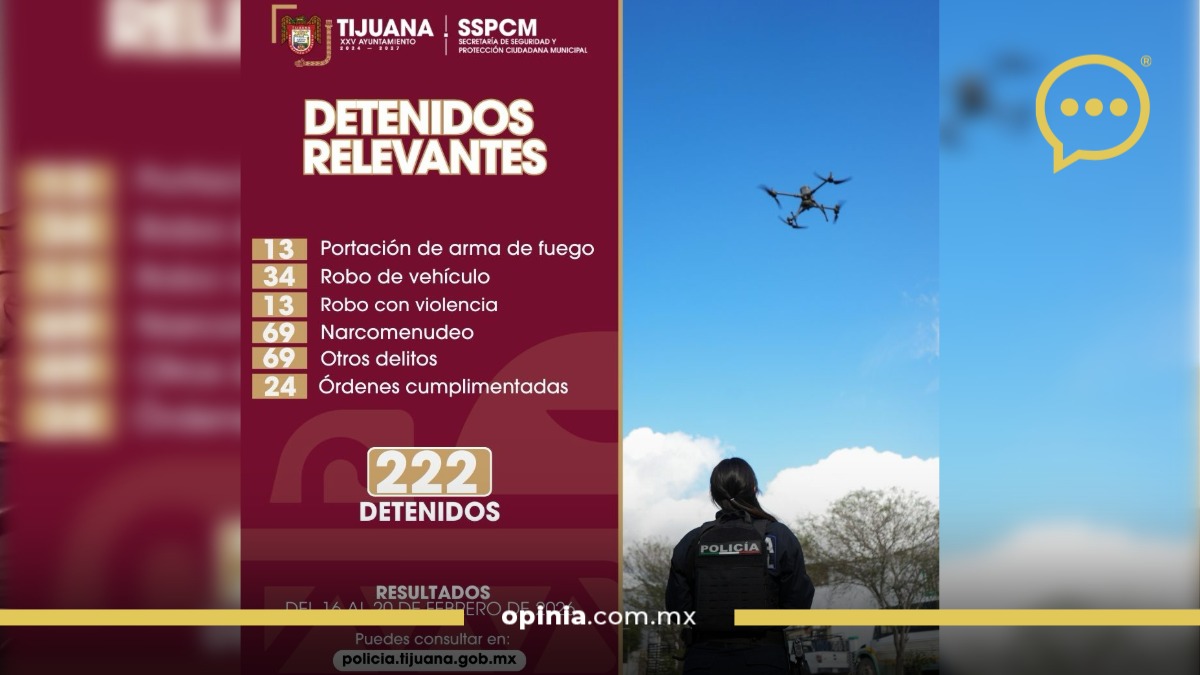 Como parte de la estrategia integral de seguridad impulsada por el Gobierno Municipal que encabeza Ismael Burgueño Ruiz, la Secretaría de Seguridad y Protección Ciudadana Municipal (SSPCM) informó la detención de 222 personas presuntamente involucradas en diversos delitos, durante el periodo comprendido del 16 al 20 de febrero.