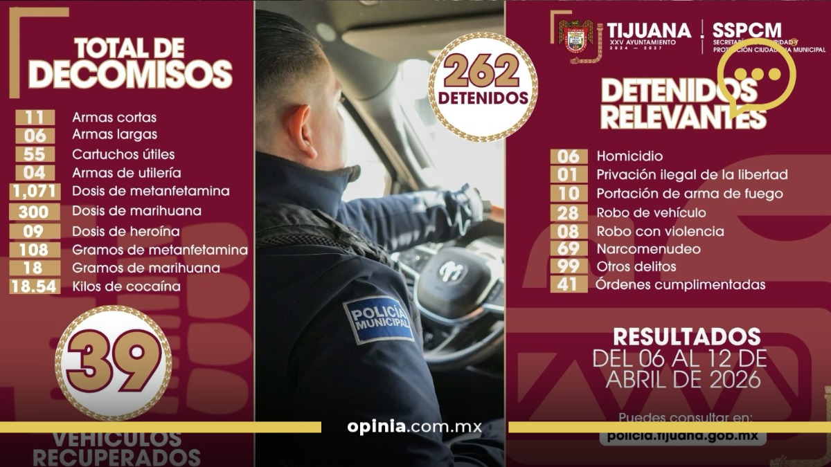 Las acciones preventivas implementadas por la Policía Municipal de Tijuana derivaron en la detención de 262 personas y el aseguramiento de 17 armas de fuego durante la semana del 6 al 12 de abril.